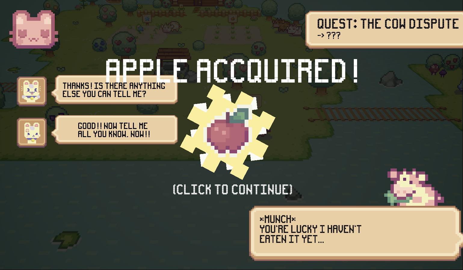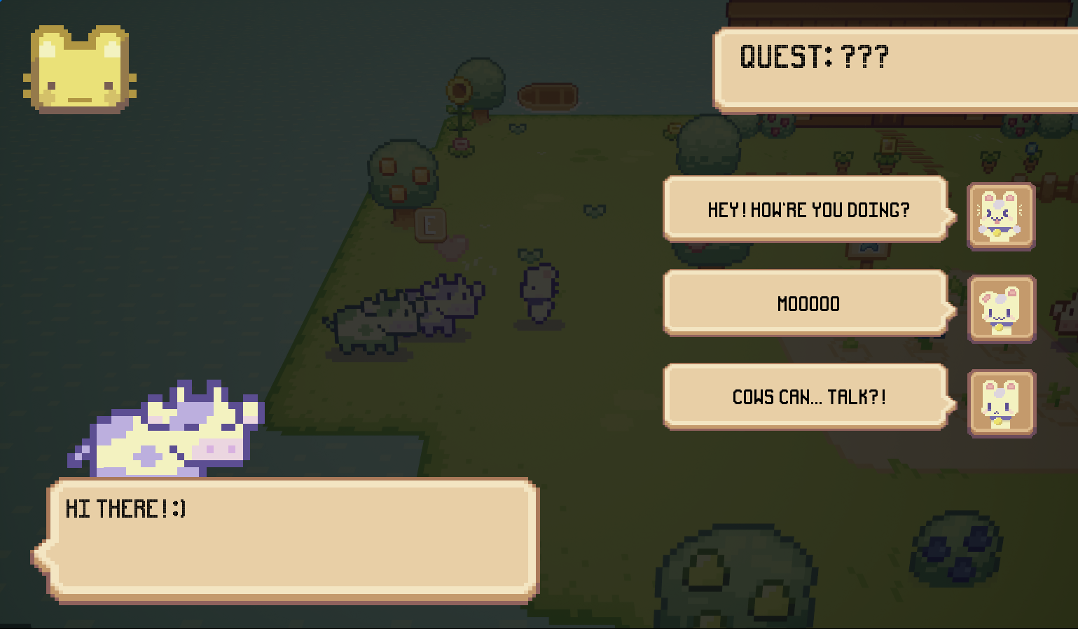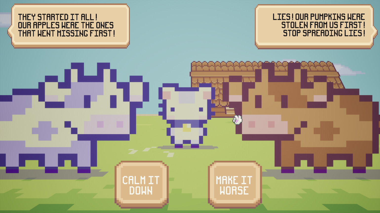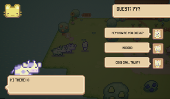 -- CowQuest is a small University project that at its core is to fit the brief of a 2.5D Game, but expands into a cute and quick, narrative story game that tackles dialogue use and how it can effect your relationship with the game characters. --